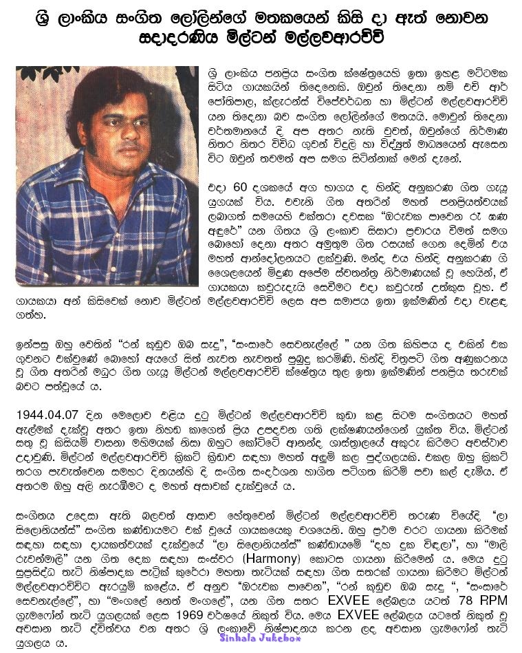 We are releasing this tribute page for Milton Mallawarachchi on his 10th death annivarsary. Milton Died on March 10th, 1998 at the age of 54. He was one of the great pop artists of Sri Lanka and is still considered as a pioneer of his style of singing sinhala songs. Milton was born on April 07, 1944. He has sung some many great all time hits among which one can count hits such as "Oruwaka Paawena," and "Sansara Sewanelle".