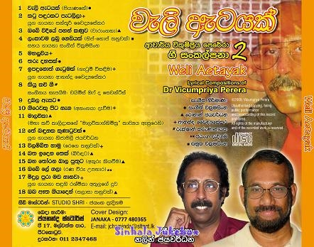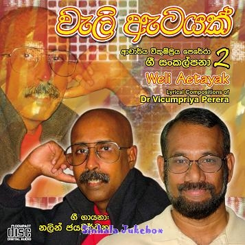 We are also featuring all 18 songs from the latest album of Vicumpriya Perera titled Weli Atayak for your listening pleasure. "Vicumpriya Perera Lyrics 02 - Weli Aetayak" features 18 original songs written by Vicumpriya Perera and sung by Nalin. Music direction for the CD was done by Sangeeth Wickramasinghe, Ananda Waidyasekera, Rohan Jayawardena, Sanuka Wickramasinghe, Rukshan Karunanayake, and Jayanga Dedigama. Duet singers are Santhuri Waidyasekera, Sangeeth Wickramasinghe, Ananda Waidyasekera, Nijamali Jayawardena, and Sanduni Rashmika.