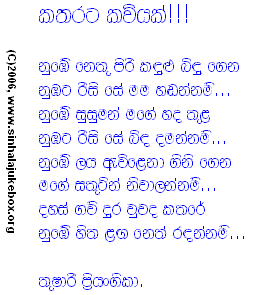 You are hereby invited to submit "Geetha Katha" for possible publication in this page. We reserve the rights to choose what will be presented, yet submitter is responsible for the content and not the page maintainers. We welcome all forms of creative work including but not limited to short stories, jokes, poems, and satire either in Sinhala and/or English.
