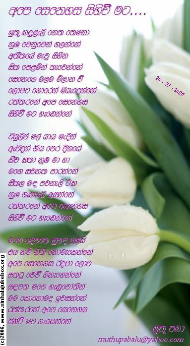 You are hereby invited to submit "Geetha Katha" for possible publication in this page. We reserve the rights to choose what will be presented, yet submitter is responsible for the content and not the page maintainers. We welcome all forms of creative work including but not limited to short stories, jokes, poems, and satire either in Sinhala and/or English.