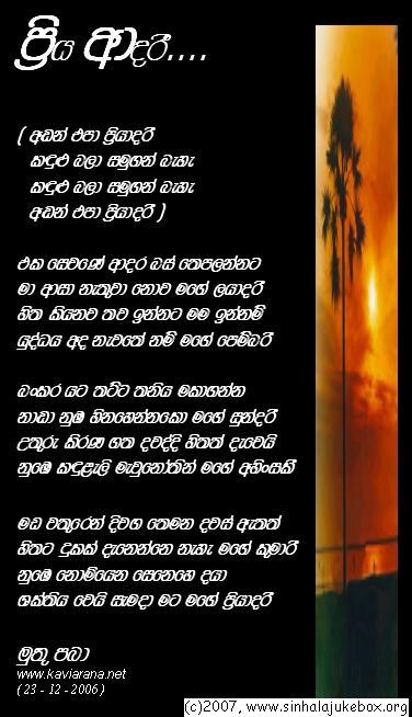 You are hereby invited to submit "Geetha Katha" for possible publication in this page. We reserve the rights to choose what will be presented, yet submitter is responsible for the content and not the page maintainers. We welcome all forms of creative work including but not limited to short stories, jokes, poems, and satire either in Sinhala and/or English.