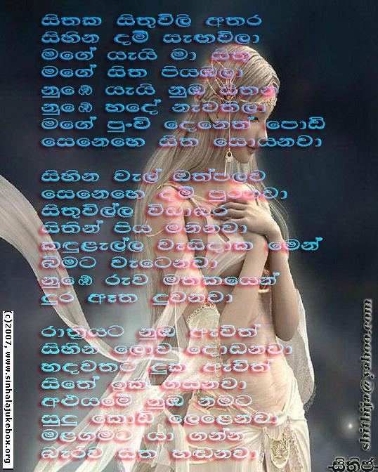 You are hereby invited to submit "Geetha Katha" for possible publication in this page. We reserve the rights to choose what will be presented, yet submitter is responsible for the content and not the page maintainers. We welcome all forms of creative work including but not limited to short stories, jokes, poems, and satire either in Sinhala and/or English.